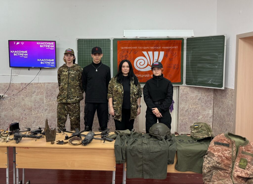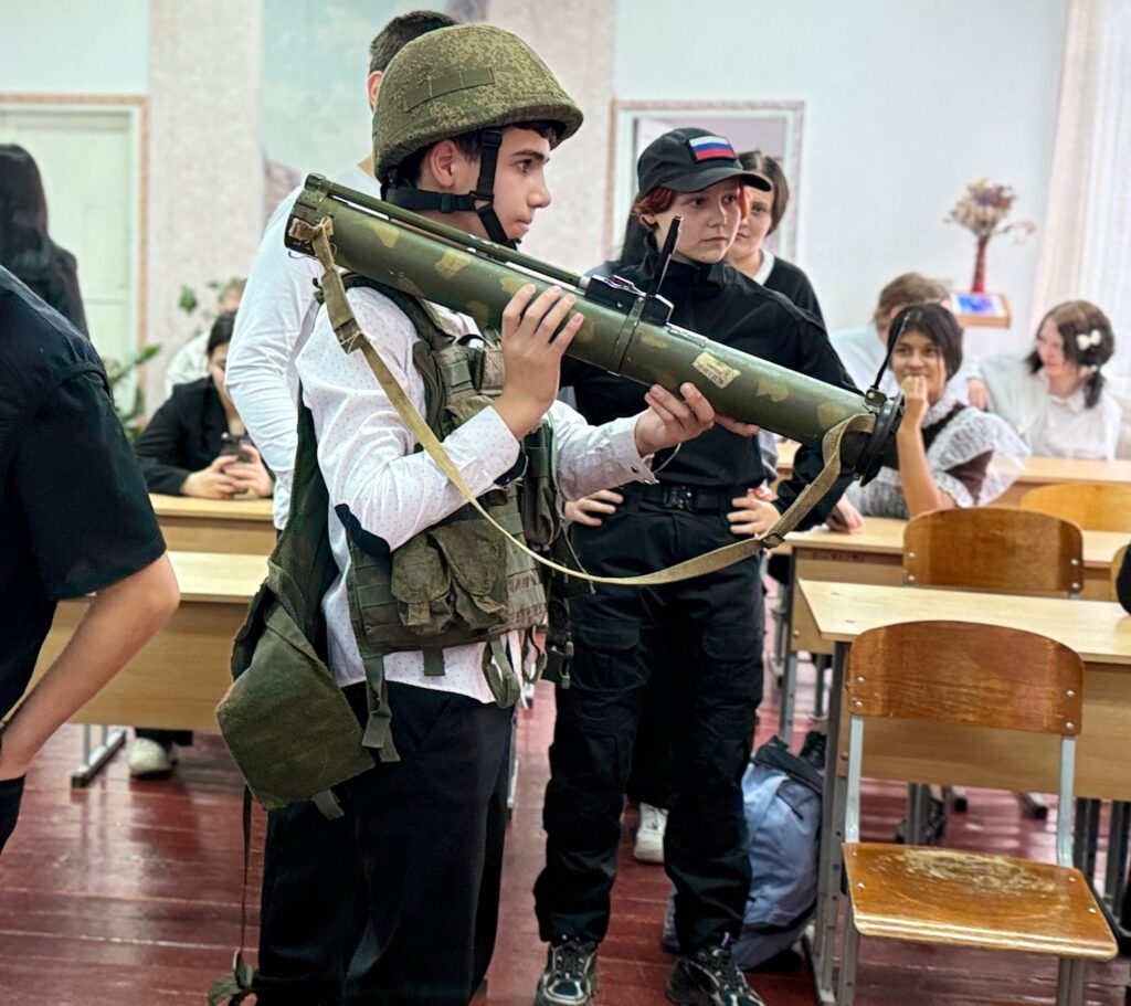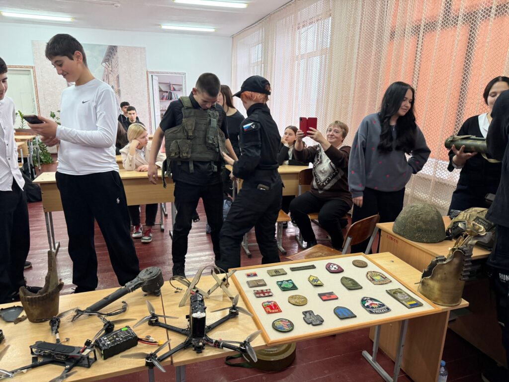 Школьники охотно примерили амуницию и рассмотрели трофеи.